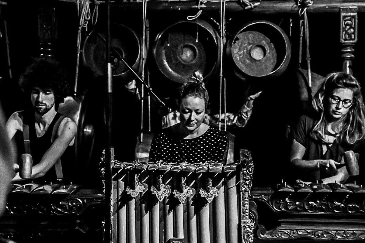 The ensemble uses the metallophones, hand drums and gongs of the traditional Gamelan ensembles, alongside drums and other percussions, classic, found and junk. The music presented is grounded in Guthrie’s travels in Indonesia and his studies of various forms of Gamelan music, such as the stately Gamelan Sekaten and the trance ritual Jathilan, both from Java, and Gamelan Salukat of contemporary Balinese composer Dewa Alit. These influences are combined with the eclectic backgrounds of the group members in noise, avant-jazz and electro-acoustic music.