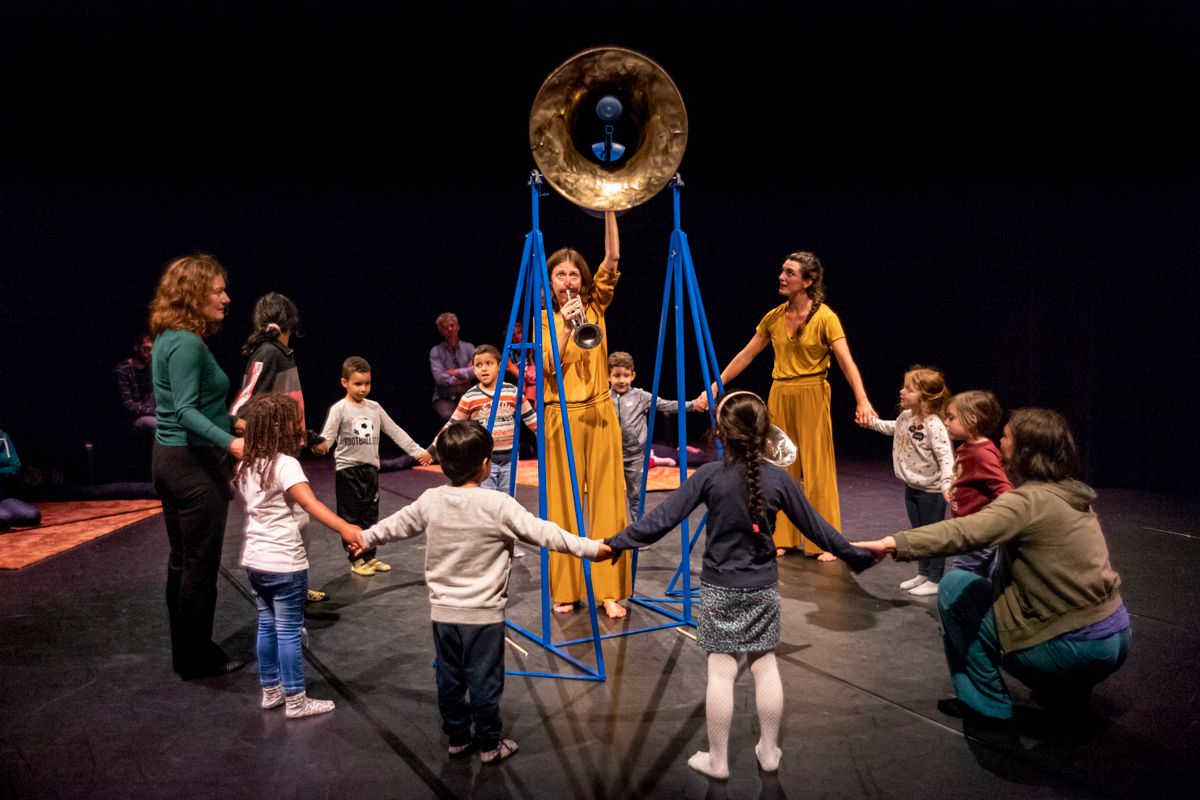 Een danseres, een trompettist en een mimespeler brengen een speelse en interactieve installatie tot leven. Zij nodigen iedereen, van baby tot overgrootouder, uit om de ruimte en bijzondere geluidsobjecten van dichtbij te ontdekken. De installatie vormt een doorlopende, vloeiende ervaring met ongekende instrumenten, sensoren en objecten waar je in, uit, langs en doorheen kunt lopen.